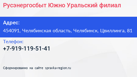 Русэнергосбыт, Южно-Уральский филиал по адресу 454091, Челябинская область, Челябинск, Цвиллинга, 81 в дальнейшем Организация, размещена в следующих категориях: