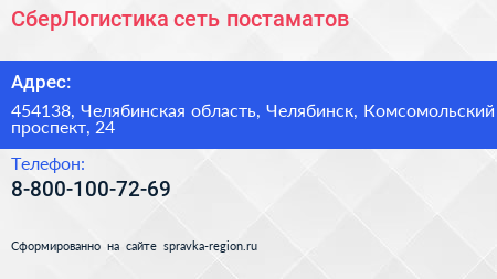 СберЛогистика, сеть постаматов по адресу 454138, Челябинская область, Челябинск, Комсомольский проспект, 24 в дальнейшем Организация, размещена в следующих категориях: