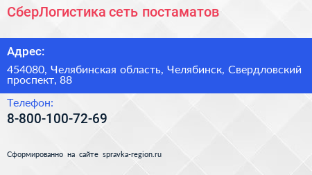 СберЛогистика, сеть постаматов по адресу 454080, Челябинская область, Челябинск, Свердловский проспект, 88 в дальнейшем Организация, размещена в следующих категориях: