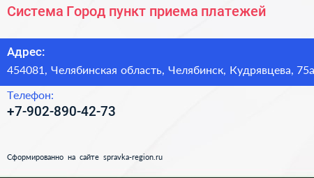 Система Город, пункт приема платежей по адресу 454081, Челябинская область, Челябинск, Кудрявцева, 75а в дальнейшем Организация, размещена в следующих категориях:
