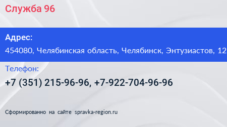 Служба 96 по адресу 454080, Челябинская область, Челябинск, Энтузиастов, 12 в дальнейшем Организация, размещена в следующих категориях: