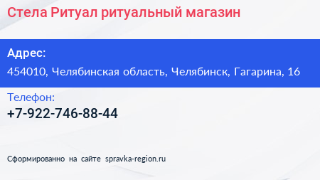 Стела-Ритуал, ритуальный магазин по адресу 454010, Челябинская область, Челябинск, Гагарина, 16 в дальнейшем Организация, размещена в следующих категориях: