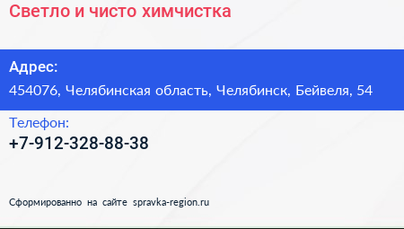 Светло и чисто, химчистка по адресу 454076, Челябинская область, Челябинск, Бейвеля, 54 в дальнейшем Организация, размещена в следующих категориях: