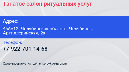 Танатос, салон ритуальных услуг по адресу 456612, Челябинская область, Челябинск, Артиллерийская, 2а в дальнейшем Организация, размещена в следующих категориях: