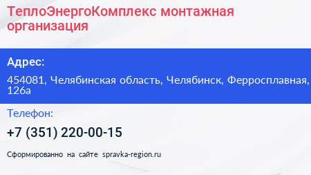 ТеплоЭнергоКомплекс, монтажная организация по адресу 454081, Челябинская область, Челябинск, Ферросплавная, 126а в дальнейшем Организация, размещена в следующих категориях: