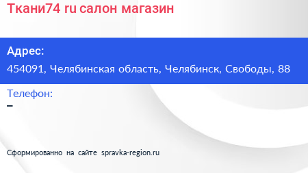 Ткани74.ru, салон-магазин по адресу 454091, Челябинская область, Челябинск, Свободы, 88 в дальнейшем Организация, размещена в следующих категориях:
