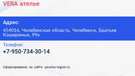 VERA, ателье по адресу 454016, Челябинская область, Челябинск, Братьев Кашириных, 99а в дальнейшем Организация, размещена в следующих категориях: