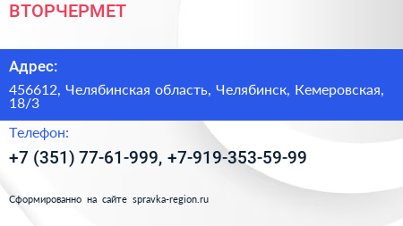 ВТОРЧЕРМЕТ по адресу 456612, Челябинская область, Челябинск, Кемеровская, 18/3 в дальнейшем Организация, размещена в следующих категориях: