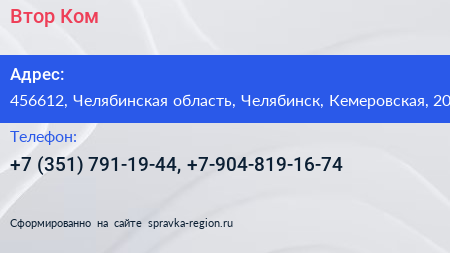 Втор-Ком по адресу 456612, Челябинская область, Челябинск, Кемеровская, 20 в дальнейшем Организация, размещена в следующих категориях: