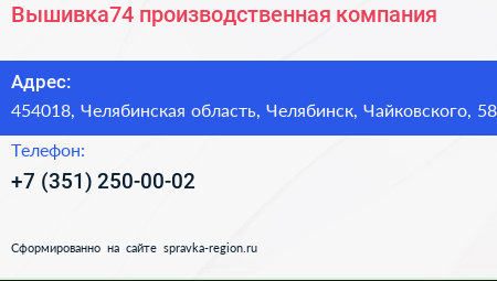 Вышивка74, производственная компания по адресу 454018, Челябинская область, Челябинск, Чайковского, 58 в дальнейшем Организация, размещена в следующих категориях: