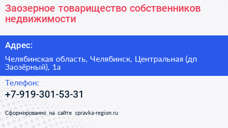 Заозерное, товарищество собственников недвижимости по адресу Челябинская область, Челябинск, Центральная (дп Заозёрный), 1а в дальнейшем Организация, размещена в следующих категориях: