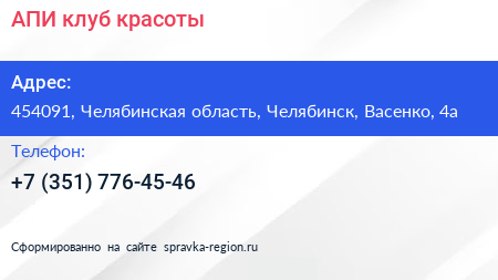 АПИ, клуб красоты по адресу 454091, Челябинская область, Челябинск, Васенко, 4а в дальнейшем Организация, размещена в следующих категориях: