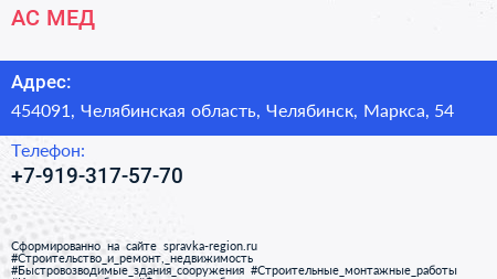 АС-МЕД по адресу 454091, Челябинская область, Челябинск, Маркса, 54 в дальнейшем Организация, размещена в следующих категориях: