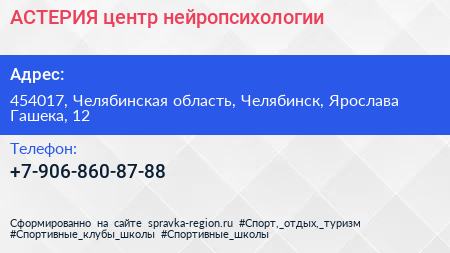 АСТЕРИЯ, центр нейропсихологии по адресу 454017, Челябинская область, Челябинск, Ярослава Гашека, 12 в дальнейшем Организация, размещена в следующих категориях: