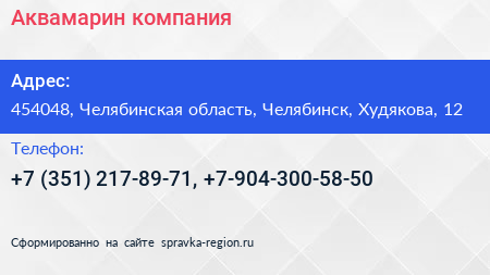 Аквамарин, компания по адресу 454048, Челябинская область, Челябинск, Худякова, 12 в дальнейшем Организация, размещена в следующих категориях: