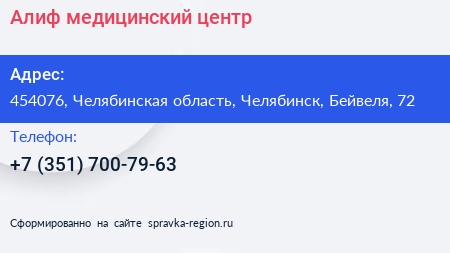 Алиф, медицинский центр по адресу 454076, Челябинская область, Челябинск, Бейвеля, 72 в дальнейшем Организация, размещена в следующих категориях: