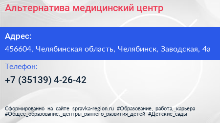 Альтернатива, медицинский центр по адресу 456604, Челябинская область, Челябинск, Заводская, 4а в дальнейшем Организация, размещена в следующих категориях: