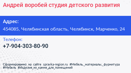 Андрей-воробей, студия детского развития по адресу 454085, Челябинская область, Челябинск, Марченко, 24 в дальнейшем Организация, размещена в следующих категориях: