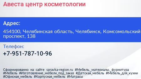 Авеста, центр косметологии по адресу 454100, Челябинская область, Челябинск, Комсомольский проспект, 138 в дальнейшем Организация, размещена в следующих категориях: