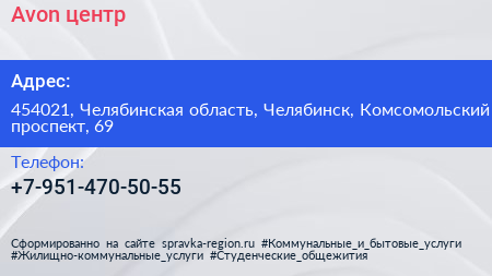 Avon, центр по адресу 454021, Челябинская область, Челябинск, Комсомольский проспект, 69 в дальнейшем Организация, размещена в следующих категориях: