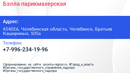 Бэлла, парикмахерская по адресу 454016, Челябинская область, Челябинск, Братьев Кашириных, 105а в дальнейшем Организация, размещена в следующих категориях:
