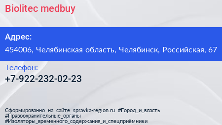 Biolitec medbuy по адресу 454006, Челябинская область, Челябинск, Российская, 67 в дальнейшем Организация, размещена в следующих категориях: