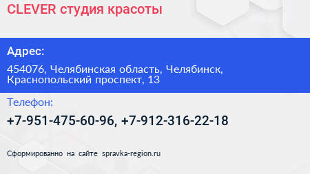 CLEVER, студия красоты по адресу 454076, Челябинская область, Челябинск, Краснопольский проспект, 13 в дальнейшем Организация, размещена в следующих категориях: