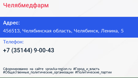 Челябмедфарм по адресу 456513, Челябинская область, Челябинск, Ленина, 5 в дальнейшем Организация, размещена в следующих категориях: