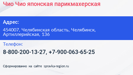 Чио Чио, японская парикмахерская по адресу 454007, Челябинская область, Челябинск, Артиллерийская, 136 в дальнейшем Организация, размещена в следующих категориях: