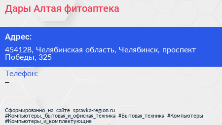 Дары Алтая, фитоаптека по адресу 454128, Челябинская область, Челябинск, проспект Победы, 325 в дальнейшем Организация, размещена в следующих категориях: