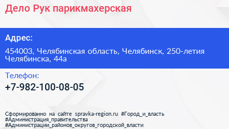 Дело Рук, парикмахерская по адресу 454003, Челябинская область, Челябинск, 250-летия Челябинска, 44а в дальнейшем Организация, размещена в следующих категориях: