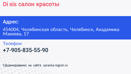 Di sis, салон красоты по адресу 454004, Челябинская область, Челябинск, Академика Макеева, 17 в дальнейшем Организация, размещена в следующих категориях: