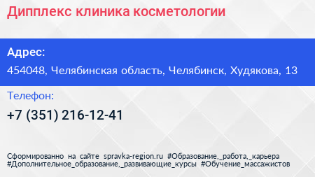 Дипплекс, клиника косметологии по адресу 454048, Челябинская область, Челябинск, Худякова, 13 в дальнейшем Организация, размещена в следующих категориях: