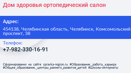 Дом здоровья, ортопедический салон по адресу 454138, Челябинская область, Челябинск, Комсомольский проспект, 38 в дальнейшем Организация, размещена в следующих категориях: