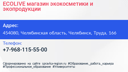 ECOLIVE, магазин экокосметики и экопродукции по адресу 454080, Челябинская область, Челябинск, Труда, 166 в дальнейшем Организация, размещена в следующих категориях: