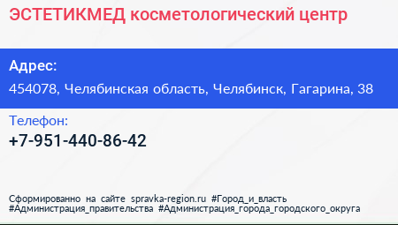 ЭСТЕТИКМЕД, косметологический центр по адресу 454078, Челябинская область, Челябинск, Гагарина, 38 в дальнейшем Организация, размещена в следующих категориях: