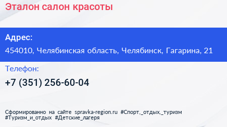 Эталон, салон красоты по адресу 454010, Челябинская область, Челябинск, Гагарина, 21 в дальнейшем Организация, размещена в следующих категориях: