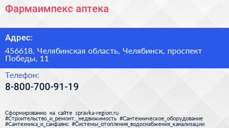 Фармаимпекс, аптека по адресу 456618, Челябинская область, Челябинск, проспект Победы, 11 в дальнейшем Организация, размещена в следующих категориях: