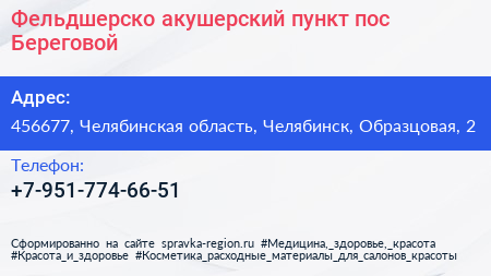 Фельдшерско-акушерский пункт, пос. Береговой по адресу 456677, Челябинская область, Челябинск, Образцовая, 2 в дальнейшем Организация, размещена в следующих категориях: