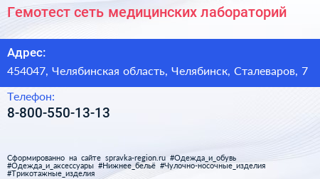 Гемотест, сеть медицинских лабораторий по адресу 454047, Челябинская область, Челябинск, Сталеваров, 7 в дальнейшем Организация, размещена в следующих категориях: