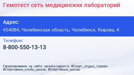 Гемотест, сеть медицинских лабораторий по адресу 454084, Челябинская область, Челябинск, Кирова, 4 в дальнейшем Организация, размещена в следующих категориях: