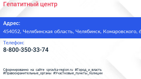 Гепатитный центр по адресу 454052, Челябинская область, Челябинск, Комаровского, 6 в дальнейшем Организация, размещена в следующих категориях: