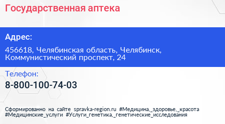 Государственная аптека по адресу 456618, Челябинская область, Челябинск, Коммунистический проспект, 24 в дальнейшем Организация, размещена в следующих категориях: