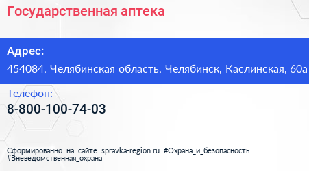 Государственная аптека по адресу 454084, Челябинская область, Челябинск, Каслинская, 60а в дальнейшем Организация, размещена в следующих категориях: