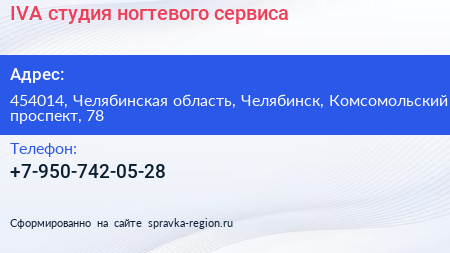 IVA, студия ногтевого сервиса по адресу 454014, Челябинская область, Челябинск, Комсомольский проспект, 78 в дальнейшем Организация, размещена в следующих категориях: