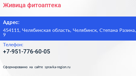 Живица, фитоаптека по адресу 454111, Челябинская область, Челябинск, Степана Разина, 9 в дальнейшем Организация, размещена в следующих категориях:
