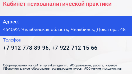 Кабинет психоаналитической практики по адресу 454092, Челябинская область, Челябинск, Доватора, 48 в дальнейшем Организация, размещена в следующих категориях: