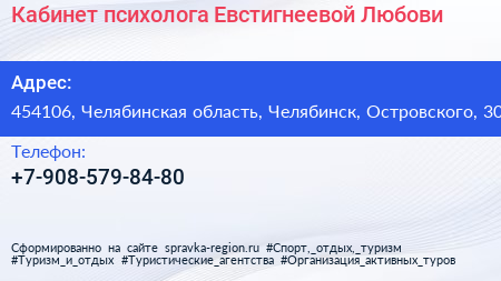 Кабинет психолога Евстигнеевой Любови по адресу 454106, Челябинская область, Челябинск, Островского, 30 в дальнейшем Организация, размещена в следующих категориях: