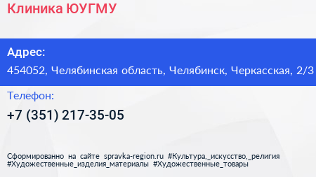 Клиника, ЮУГМУ по адресу 454052, Челябинская область, Челябинск, Черкасская, 2/3 в дальнейшем Организация, размещена в следующих категориях: