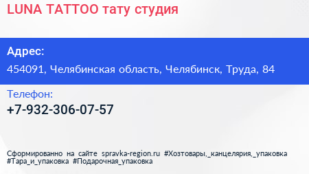 LUNA TATTOO, тату-студия по адресу 454091, Челябинская область, Челябинск, Труда, 84 в дальнейшем Организация, размещена в следующих категориях: